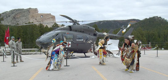 Traditional dancers perform in honor of the South Dakota National Guard’s newest aircraft, the UH-72A Lakota Light Utility Helicopter. (Indianz.com)