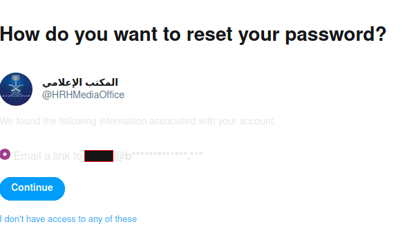 When we cross-reference website ownership with Twitter posts, it initially appears both are under friendly control. It is not likely the regime would wittingly allow knowledge of the unlawful imprisonment of a member of the royal family to become public. This assessment is supported by cross-referencing known website and email information with the princess’ Twitter account using information leaked from Twitter’s password recovery page.