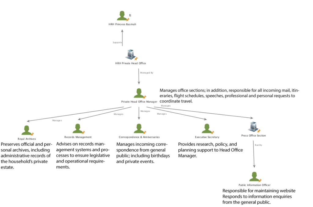 As we seek to better understand account ownership, PAI revealing the existence and structure of the princess’ private head office — located in Jeddah — proves valuable. The below graph documents the basic structure of her office, the various positions within it, and their general responsibilities. The office, reportedly managed by a close family member, is the primary conduit through which all news, inquiries, and management of her affairs are routed.