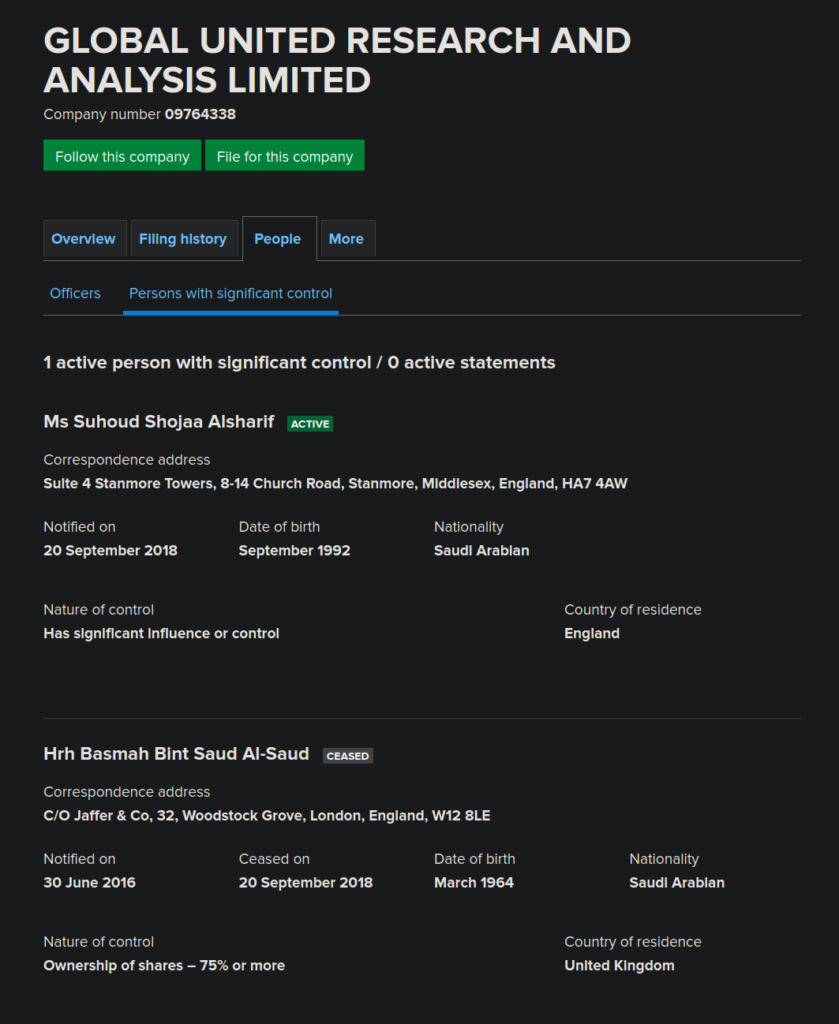 One such platform was a social thesis — The Fourth Way Law — founded by the princess to restructure societal approaches to equality and social justice. This thesis was accompanied by several Twitter accounts and a research center — Global United Research and Analysis Ltd — dedicated to the same cause. Most these companies have since gone dormant following her arrest; however, United Kingdom legal filings show the princess transferred majority control of these companies to her daughter a mere five months before their arrest. This could indicate a possible succession plan, or recognition of pending trouble to come. The below Companies House information shows the transfer of the princess’ research directorship to her daughter in September 2018.