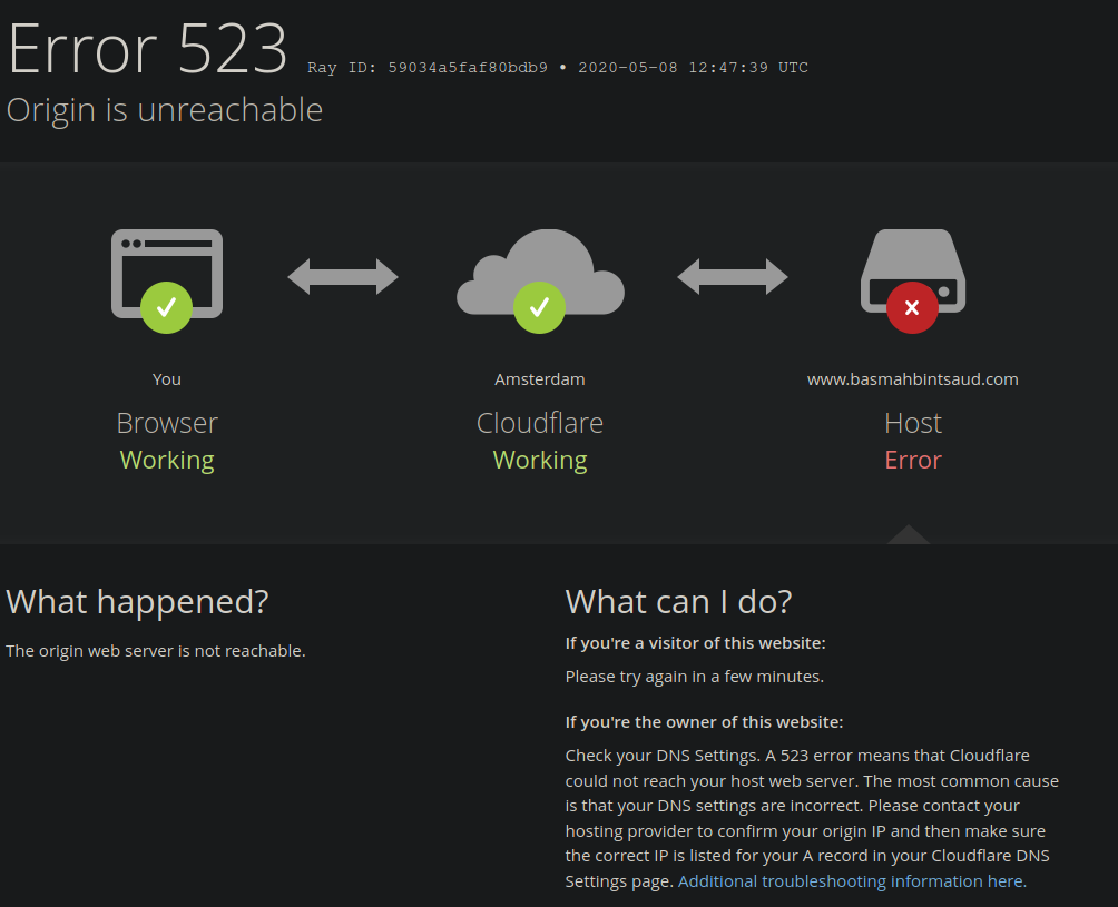 However, and most unfortunately, the bad guys also receive a vote. Several days ago, the princess’ website suddenly appeared to have gone “offline” and was not reachable. The website displayed an error suggesting an origin web server issue that prohibited the website from being accessed. While innocuous and not an uncommon error in and of itself, the website being taken down just after it had been used to call out the regime’s injustices is no coincidence. It also complicates our understanding of the situation and potentially removes our lifeline to individuals with close access to the princess and her daughter.