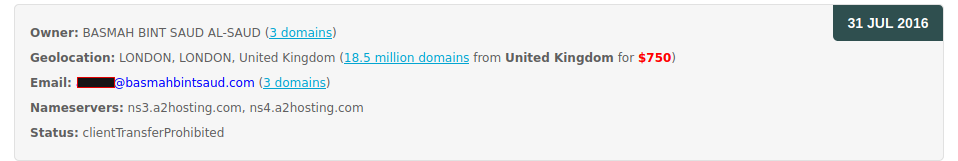 As we continue our online investigation into the circumstances surrounding the crown prince’s latest (public) victim, we seek to address how the aforementioned London addresses are relevant, if at all, and what role Mr. Haydar plays. We maintain hope that he is a staff member or someone in the princess’ inner circle, given the long period of time he worked with her to establish her many domains. It is possible this could be true, given research findings for one website registration associated with both the princess and Mr. Haydar that listed Jeddah (the princess’ Arabian residence) as the location. Such a geolocation could mean nothing, or it could mean that Princess Basmah and Mr. Haydar worked and traveled together at the same time — implying he was a staff member or close enough to her to work with her in both London and KSA.