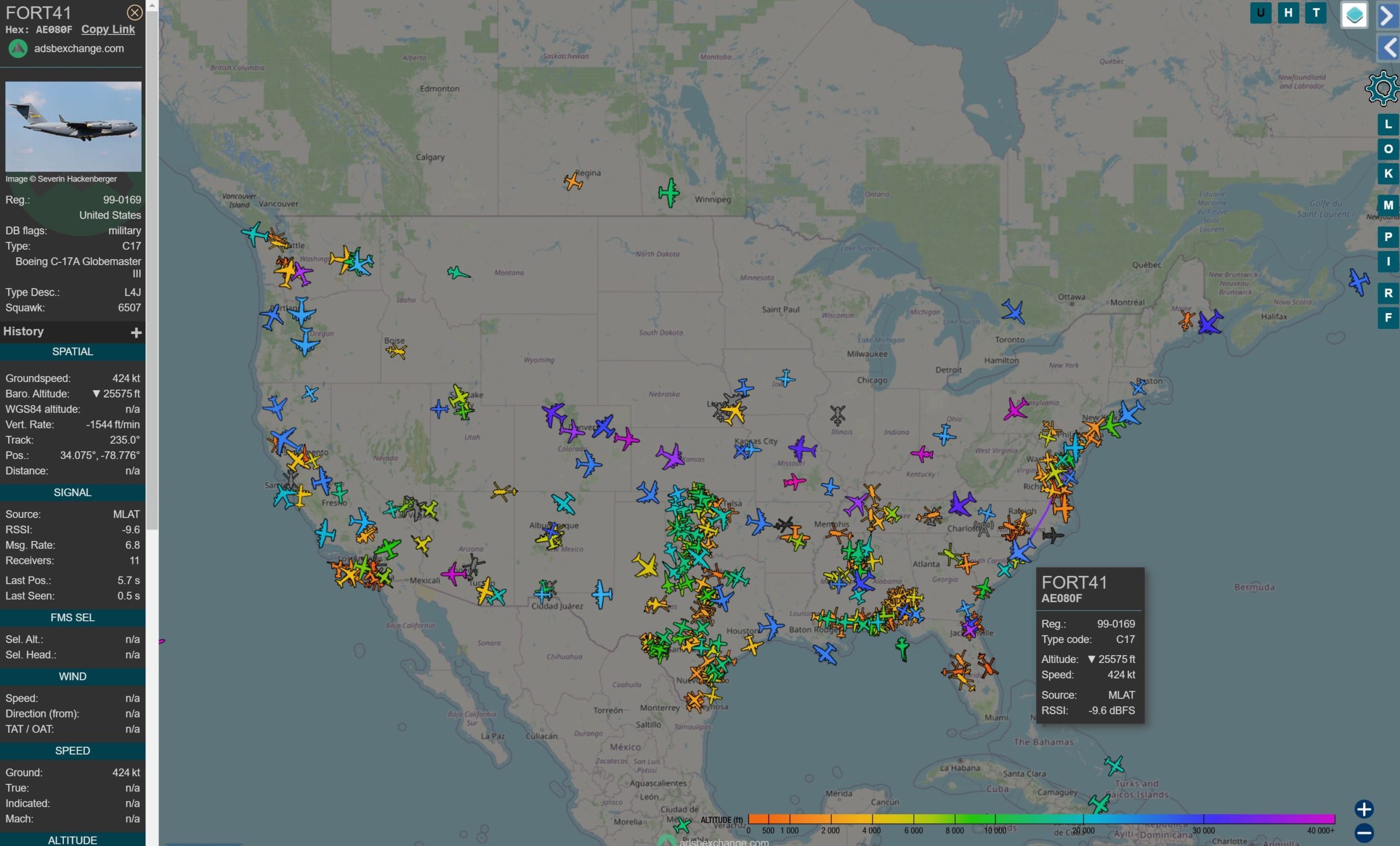 Screenshot from globe.adbsexchange.com A live view of all military aircraft in US airspace at a given time. Their attitude determines their color.
