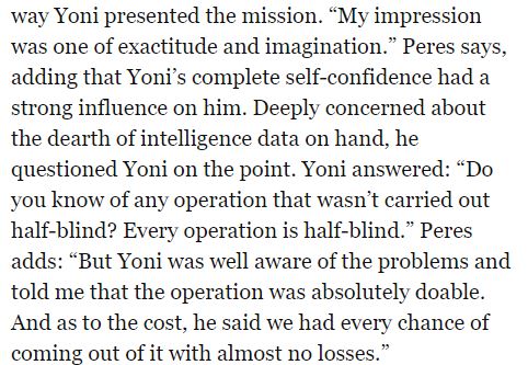 “Various ‘step-fathers’ took credit for the ideas, the plans, and the actual handling of the operation’s execution on the ground. But for me and my friends who took part in the raid, it was clear who the real biological father is: Yonatan Netanyahu… His fingerprints and footprints were evident at every stage that we were witness to, from the beginning all the way to the end of the operation, which to our great sorrow was also the end of Yoni himself.” (p. 192)