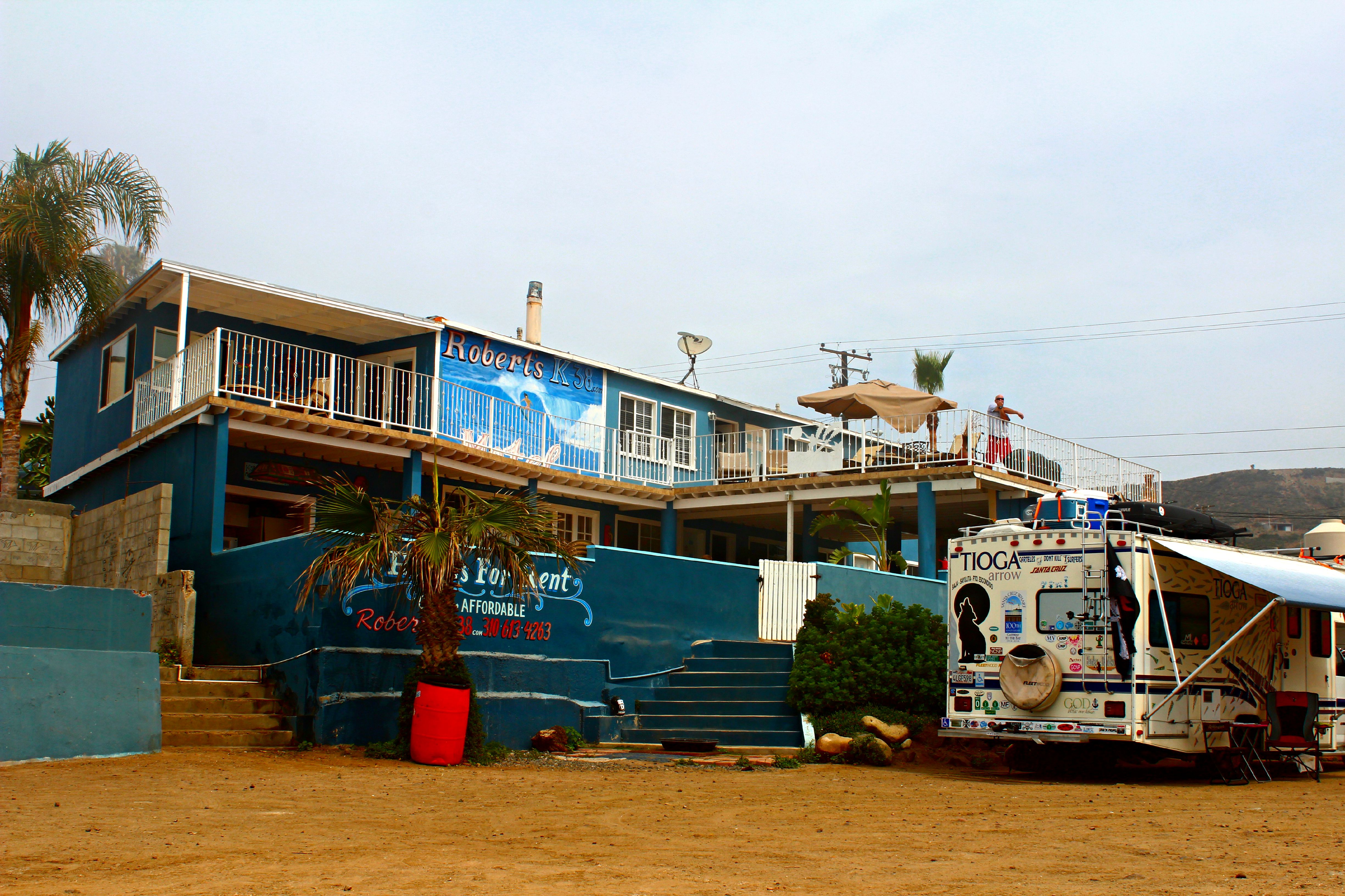 K38- Take old highway 1 (not the toll road) 38 kilometers past Tijuana, just south of Rosarito. “Robert’s K38 Hotel” is a fun and funky spot with ping-pong and good wifi, with a patio view of three different surf breaks. Its bright blue color makes it easy to see from the road. *Bonus*- A small communal kitchen lets you make your own meals. Cost is around $60 US a night for a double occupancy room.