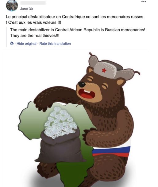 The activity shut down from Russia consisted of 63 Facebook accounts, 29 Pages, seven groups, and one Instagram account for coordinated inauthentic behavior. This campaign focused primarily on the Central African Republic (CAR), and to a lesser extent on Madagascar, Cameroon, Equatorial Guinea, Mozambique, South Africa.