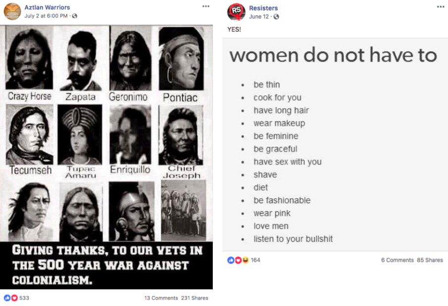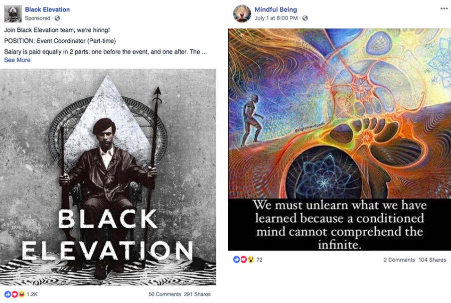 The accounts were spread across Facebook, and it’s subsidiary social media platform Instagram. The oldest of these accounts was just over a year old, with the newest created in May of 2018, and in total, they had amassed some 290,000 followers. The Facebook pages that drew the largest portions of the sum were “Aztlan Warriors,” “Black Elevation,” “Mindful Being,” and “Resisters.” Most of the other pages had very few or even zero followers but were still tied to the broader effort.