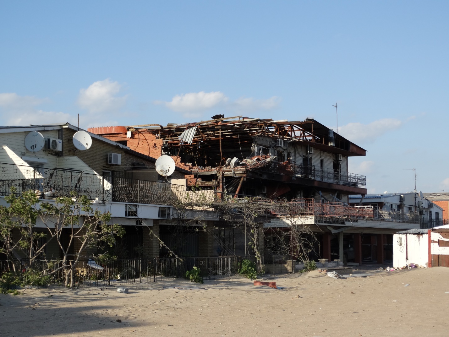 The view from a nearby hill of a shelled beachside property in Shyrokyne. In 2014, the village was known as a popular holiday resort destination.