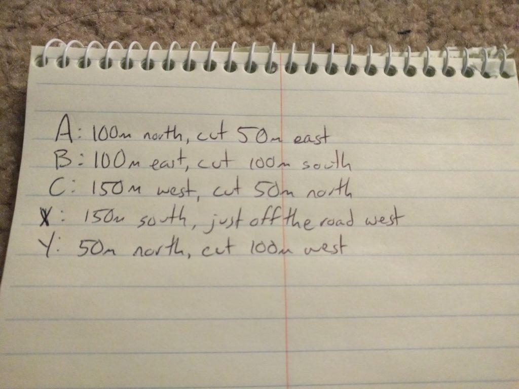 Step 3: Plot and measure your route to each point Don’t worry about getting a direct azimuth from the intersection. This is the important part: find the road that gets the closest to your point. Draw a line from the point, using a cardinal direction, straight to that road (the 50m line below). Measure the distance from that point to the road’s intersection (the 100m line). I repeat, do not get an azimuth from the intersection (unless it’s less than 25 meters or something easy). Like this: