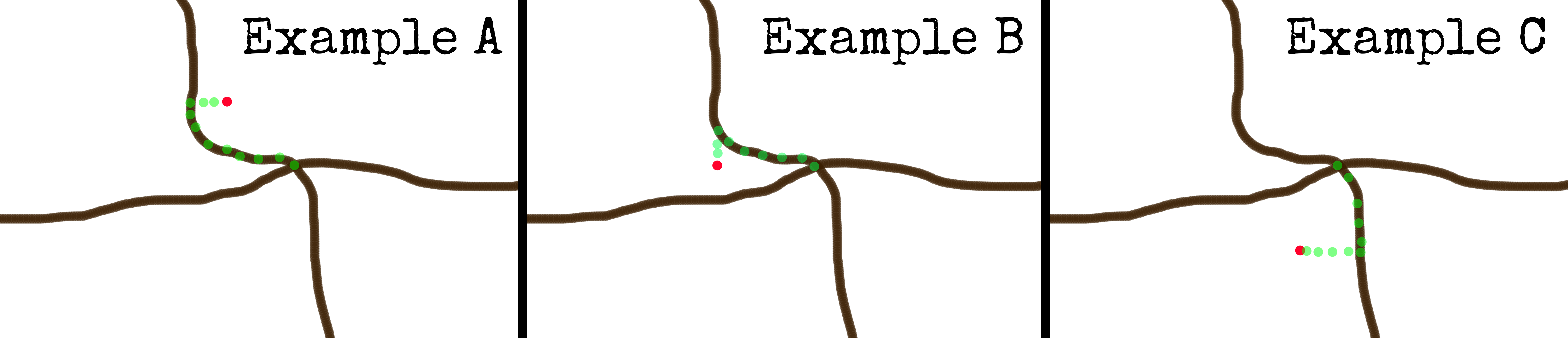 Here are some other examples, using the same method with different point locations. You can see in example B that I will even go a bit out of my way to use cardinal directions, as the time lost by going north on that road will be gained by the ease and speed of following the big S for south on my compass.