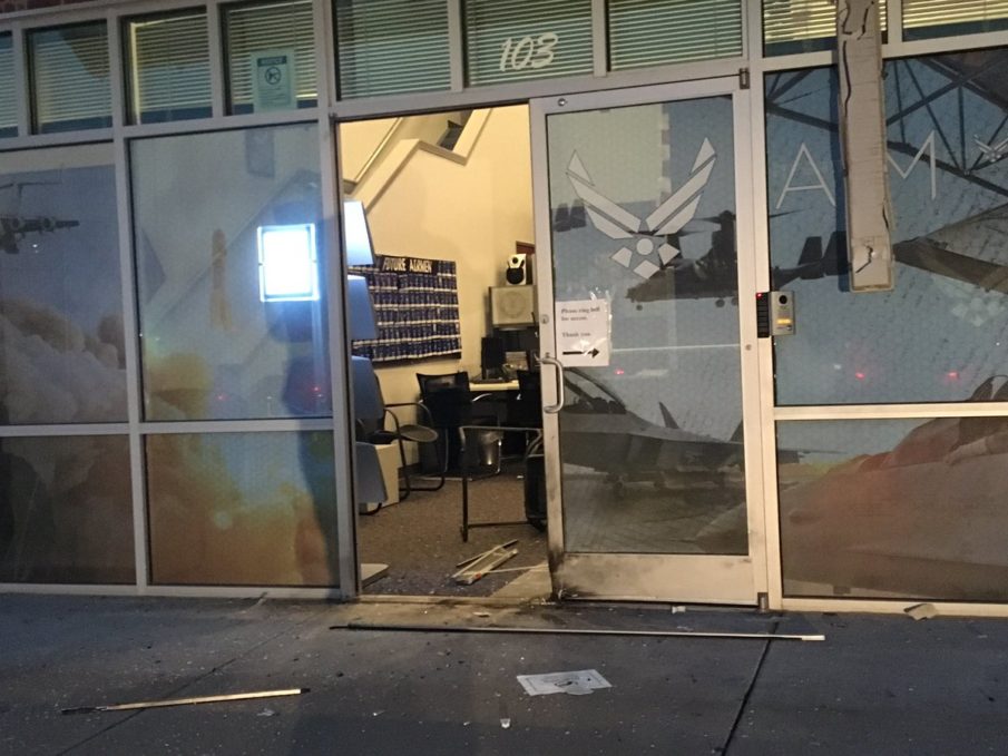 Last night at approximately 10:30 pm local time, there was an explosion at an Air Force recruiting office in Bixby, Oklahoma. The front doors are visibly damaged and no injuries have been reported. An initial report suggests that the device responsible for the blast may have been a pipe bomb. The FBI and ATF are currently investigating the incident but they have not determined if this is an act of domestic terrorism. Local news stated that a nearby restaurant has CCTV and the FBI might be able to see who placed the device. Witnesses vaguely describe the suspect as being a person on a red motorcycle.