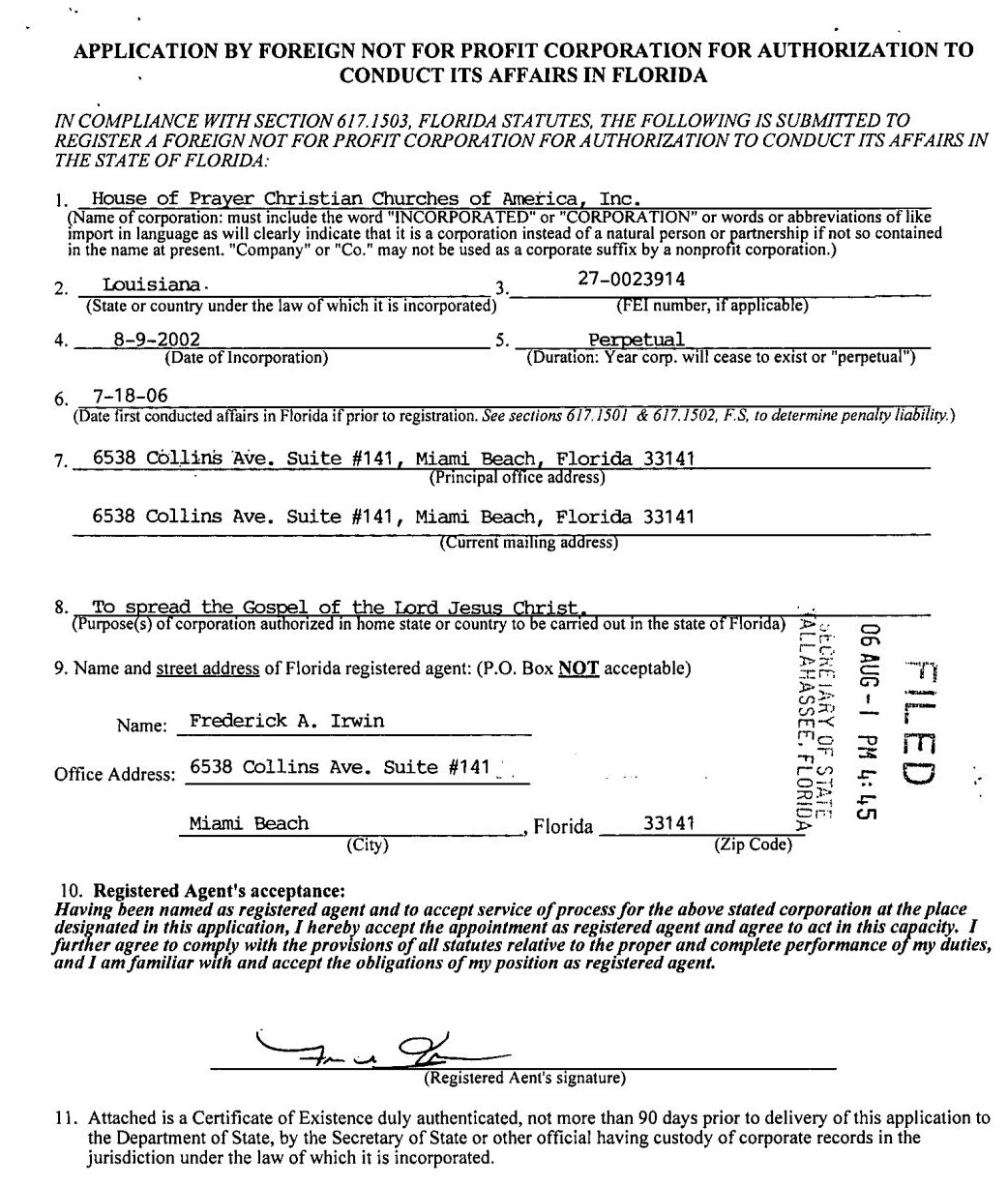 Meanwhile, a little digging revealed that “House of Prayer Christian Churches of America, Inc.“ was incorporated in Jacksonville, Florida, in 2006, but they list their home state as Lousiana. Officers and Directors as listed as follows: Gerard C. Robertson, President; David A. Reip, Officer; Dennis Nostrant, Director. All three men are recorded as being from Hinesville, GA. Hinesville is the location of one of the three House of Prayer churches raided yesterday morning.
