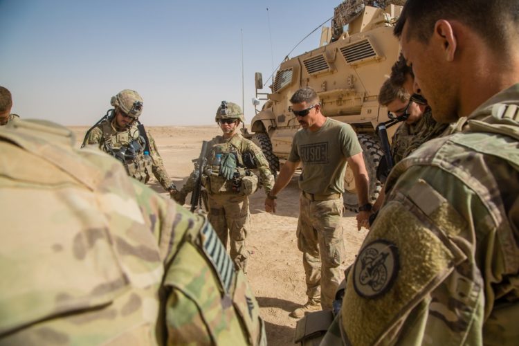 U.S. Army Chaplain Matthew Frost, 3rd Cavalry Regiment, prays with Soldiers before heading out on a key leader engagement at remote location near the Iraqi-Syrian border, June 29, 2018. Iraqi Security Forces and Coalition partners provided fire support to assist the Syrian Democratic Forces as they continue Operation Roundup, the military offensive to accelerate the defeat of ISIS remnants in the Middle Euphrates River Valley and Iraq-Syria border region. (U.S. Army photos by Spc. Anthony Zendejas IV)