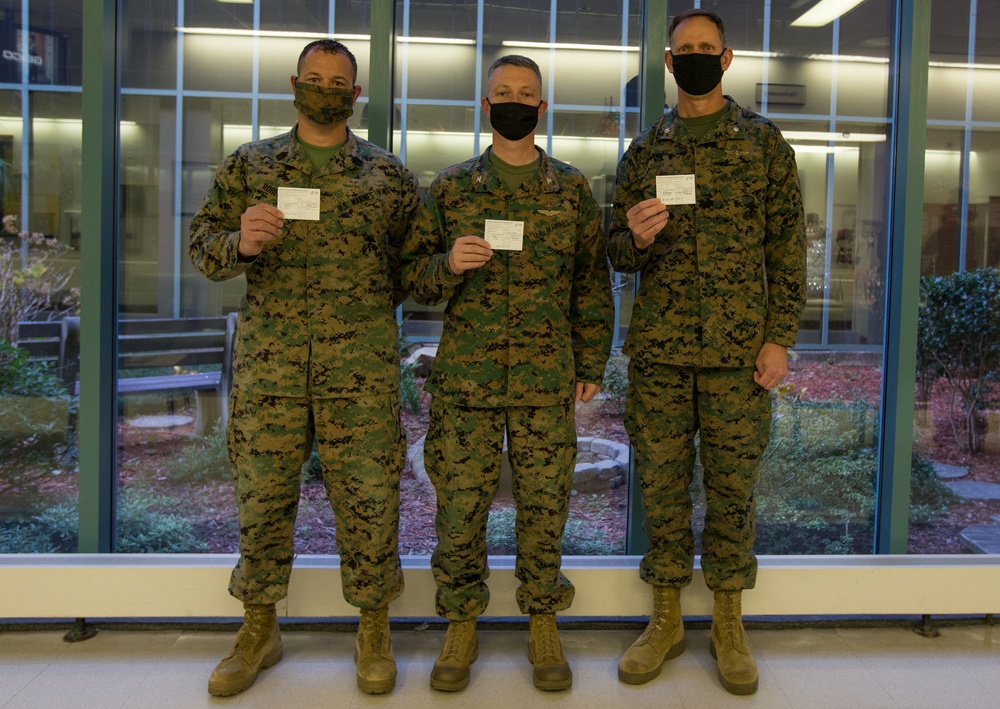 U.S. Marines Sgt. Maj. James Robertson, left, the sergeant major of Marine Corps Air Station (MCAS) Cherry Point, Col. Mikel Huber, center, the commanding officer of MCAS Cherry Point, and Lt. Col. Patrick Lindstrom, right, the executive officer of MCAS Cherry Point, pose after receiving the Moderna COVID-19 Vaccine at MCAS Cherry Point, North Carolina, on Dec. 23, 2020. The Department of Defense COVID-19 vaccination plan is phased. The vaccine received emergency use authorization from the Food and Drug Administration and election to accept the vaccination is voluntary. (U.S. Marine Corps photo by Lance Cpl. Jacob Bertram) Marine Corps Air Station Cherry Point leaders Command Sergeant Major Sgt. Maj. James Robertson, Commanding Officer Col. Mikel Huber and Executive Officer Lt. Col. Patrick Lindstrom show their vaccination cards after receiving the Moderna COVID-19 Vaccine at the Navy Health Clinic Cherry Point, North Carolina, on Dec. 23, 2020.