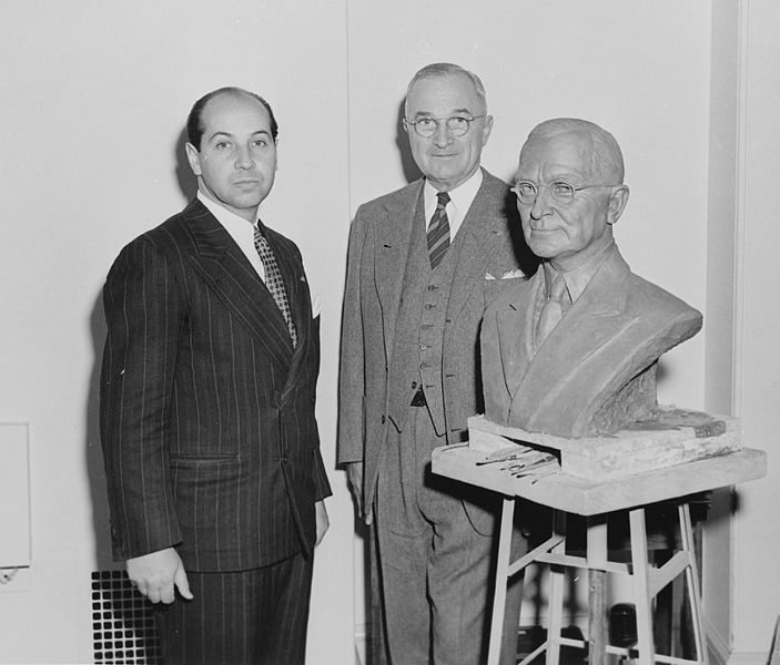 Sculptor Felix Weihs De Weldon, a Vienna born American citizen and war veteran, works on the face of one the figures in a huge United States Marine Corps Memorial, in his studio in Washington, D.C., Dec. 24, 1949. | AP Photo/Bill ChaplisSections of the 100-ton monument depicting the historic flag-raising atop Mt. Suribachi, Iwo Jima, by U.S. Marines during World War II, roll across the George Washington Bridge from New York to New Jersey, en route to Arlington, Va., Sept. 2, 1954. | AP Photo/Anthony CameranoThe figures edge closer in place as the great Iwo Jima flag raising statue is erected in bronze on the Virginia side of the Potomac, in view of the Capitol and the Washington Monument, Sept. 14, 1954, Washington, D.C. Felix De Weldon, the sculptor, right in dark suit, supervises the work. | AP Photo/William J. SmithThe United States Marine Corps War Memorial as it stands today. | AP Photo/Ron Edmonds, FileFelix Weihs de Weldon: veteran and artist in 1949, standing next to President Harry S. Truman. | Wikipedia