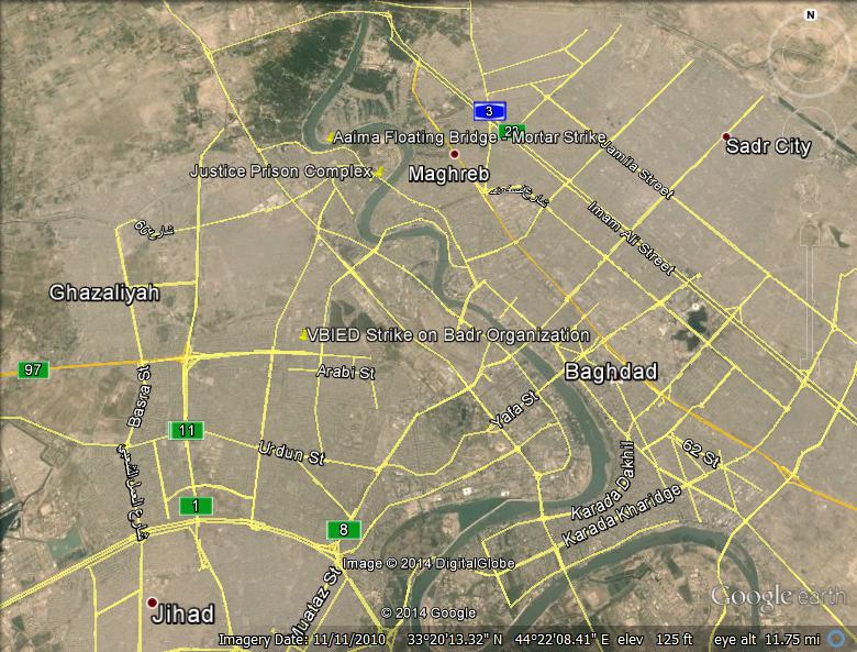 Camp Justice is now under Iraqi control, and was one of the major targets on Thursday. Fourteen mortar rounds were fired from the vicinity of Taji, in the “Baghdad Belt” at Camp Justice, and at least one suicide VBIED rammed the checkpoint leading into the prison, reportedly killing three people and wounding ten. Al Sumaria also reported mortars landing on the Aaima floating bridge across the Tigris to the north of the prison, and more on the Sunni Endowment further north of that.