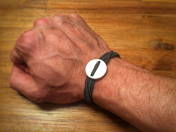 The PaceMaker Coin wrap is a simple design.A coin shaped piece of metal that is finished with waxed cotton lace that can be attached in a variety of ways.For the ladies there is a bracelet fashioned of the same metal. What is incredible about these accessories is that they are cast from unexploded ordinance.They were literally parts of a bomb at one time. The website explains, “when you buy one you help fund the clearing of 3 square meters of UXO.You literally help save life and limb”.