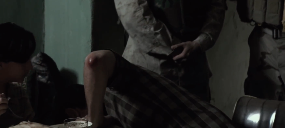 Navy SEAL sniper Chris Kyle notices the bruised elbows of his Iraqi host, which indicate that he’s a potential sniper. (Screenshot from American Sniper, property of Warner Brothers)
