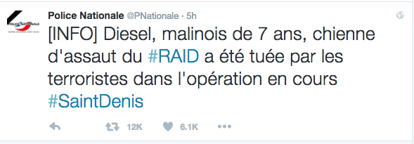 French police confirmed on Twitter at 0420ET this morning that they lost one of their finest, K9 “Diesel”.