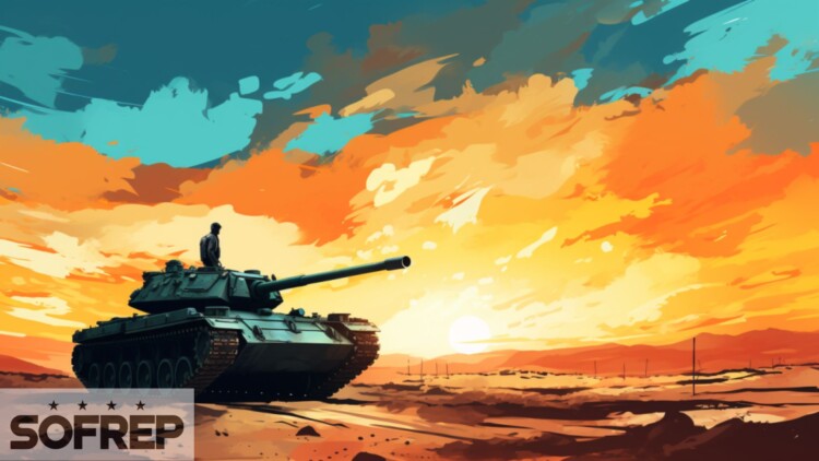 An illustration of a soldier on a tank gazing at the golden horizon. Original illustration by SOFREP