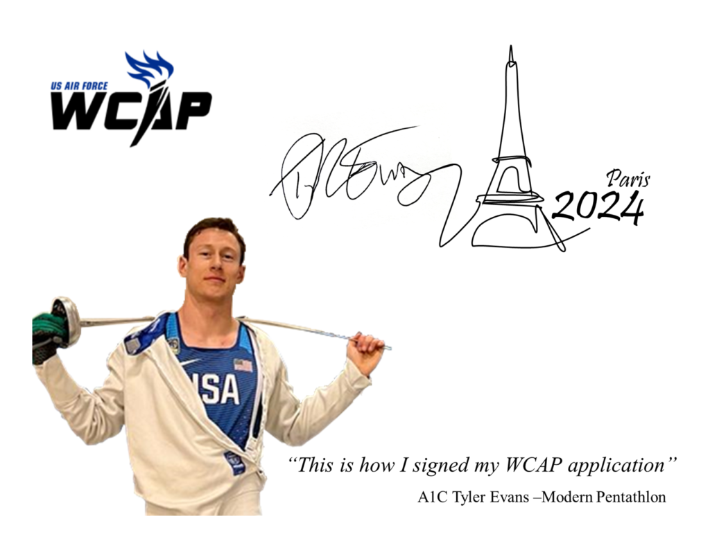 Airman 1st Class Tyler Evans, stationed at the US Air Force Academy in Colorado Springs, Colo., is a modern pentathlete and member of the Air Force World Class Athlete Program, training for the 2024 Olympic Games in Paris, France. The application window for Airmen, Guardians, Reservists, and Guardsmen, like A1C Evans, who dream of Olympic competition, is now open. Once accepted into the program, athletes train full-time for the chance to represent the DAF and the nation on the world stage. (US Air Force Graphic)