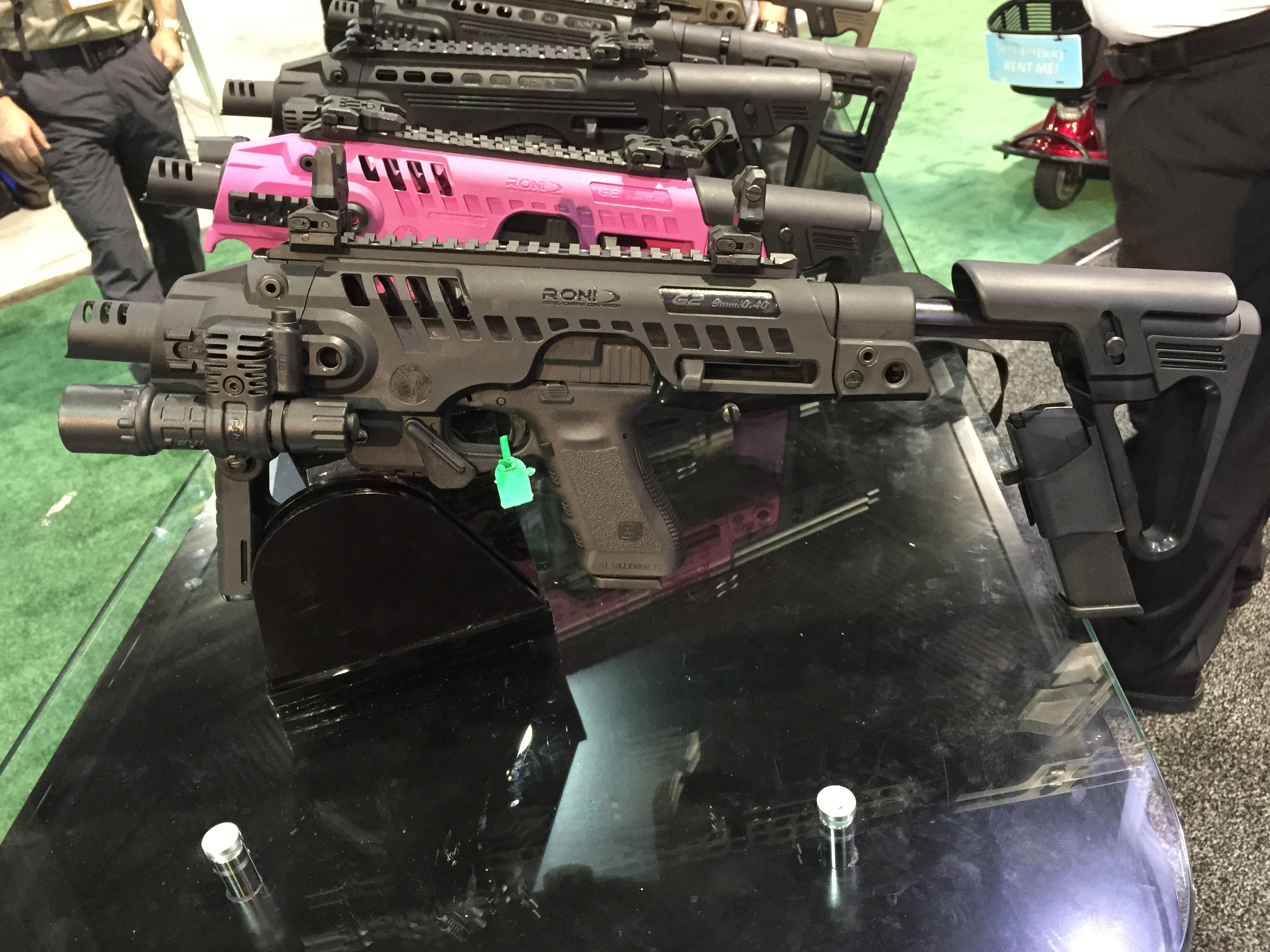 RONI Glock conversion kit: Cool idea. With the RONI, you just pull 2 pins, lay your Glock pistol inside, and wham; you’re ready for 100 meter accuracy with your pistol. That is, if you can’t do that already, which I know all of you gun nuts can.