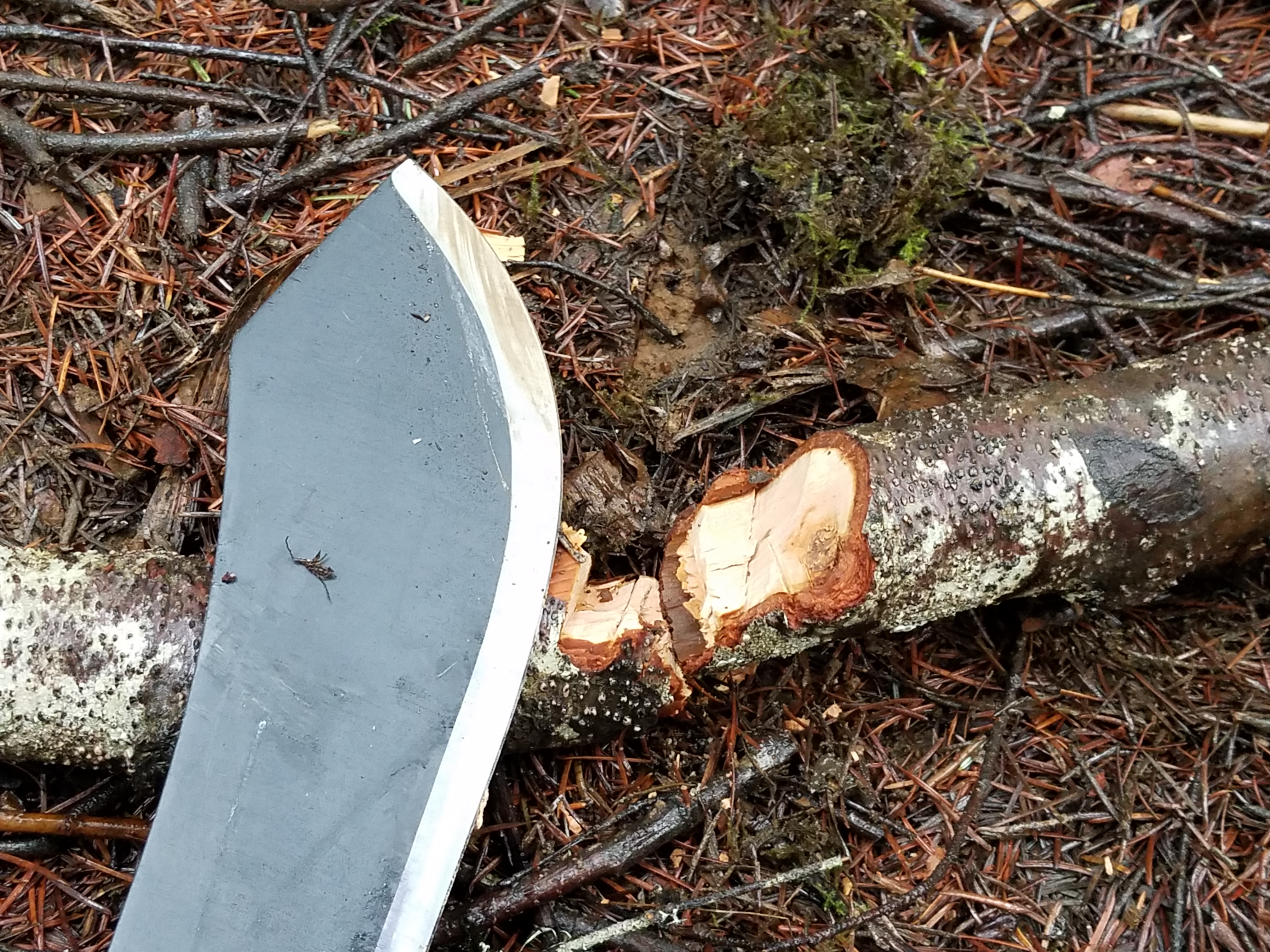 I’ll admit, I’m not a metallurgist. I understand that 1050 steel is a carbon steel, lacking in chrome or other metals to inhibit rust and corrosion. As such, the Gator Bolo needs to be dried and oiled to prevent surface rusting/discoloration. Even though my Gator showed slight surface rust after use of the machete, as evidenced by the large number of reports of chipped, folded and broken edges. Perhaps it’s more of a heat treating issue and the metal wasn’t properly tempered? I’m not certain where the problem lies, but a chopping tool that blunts so easily isn’t going to be around long. Also, made in China.