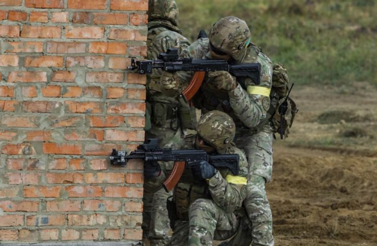 Ukrainian soldiers from the Special Police Force traverse a corner during Rapid Trident 2019. U.S. Army photo by Pvt. Joanna Gaona Gomez