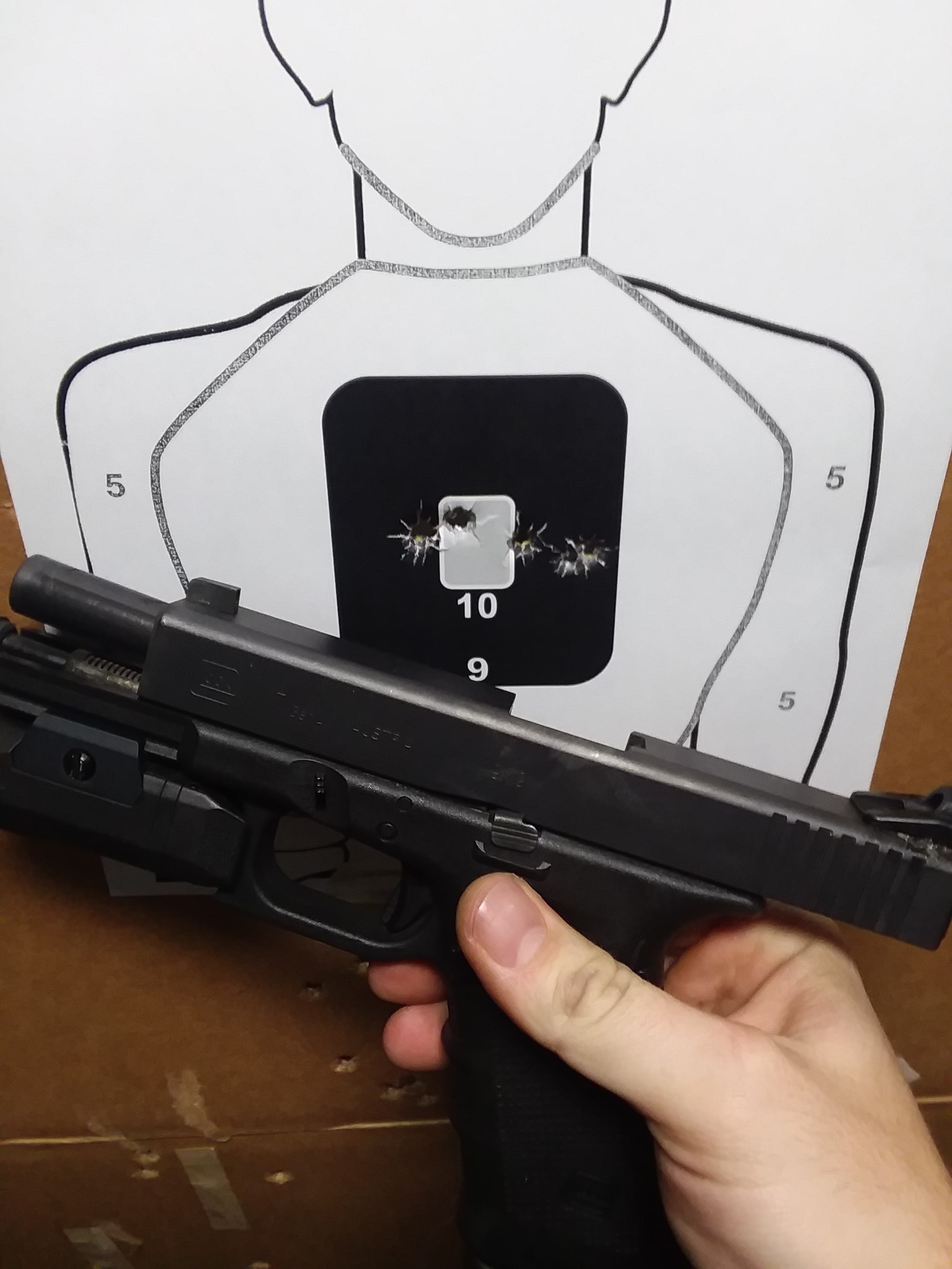 This pistol shoots great and feels great in the hands but the trigger sucks out of the box in my opinion. Its long and creepy break creates way too much room for error when utilizing rapid fire. I spent the majority of my time shooting it practicing target acquisition and ready-up drills to get used to the ghost ring sights; they had a bit of a learning curve to them. Accuracy was as expected, excellent for what it is and the gun no doubt shoots better than I do, so there’s not a whole lot to bitch about to be honest. Maintenance is simple and quick after a few repetitions, most of it wipes clean with a quick go-over. Changing out parts doesn’t require a gunsmith either, a few tools combined with a little elbow grease and you can do most modifications at your living room coffee table. The Glock 17 is a great bang for your buck but more important than the pistol model is that you get out and train with it!