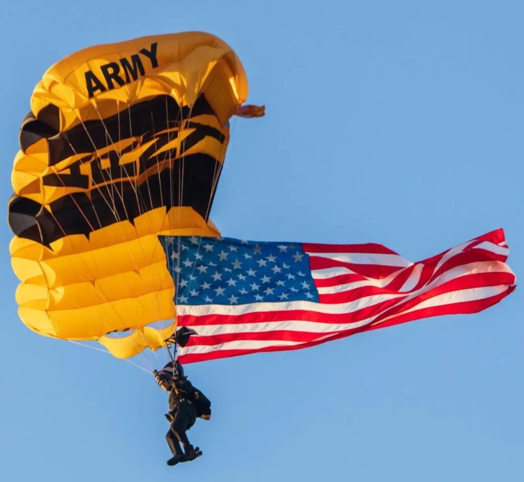 A Golden Knight carries Old Glory. Photo courtesy of the United States Army