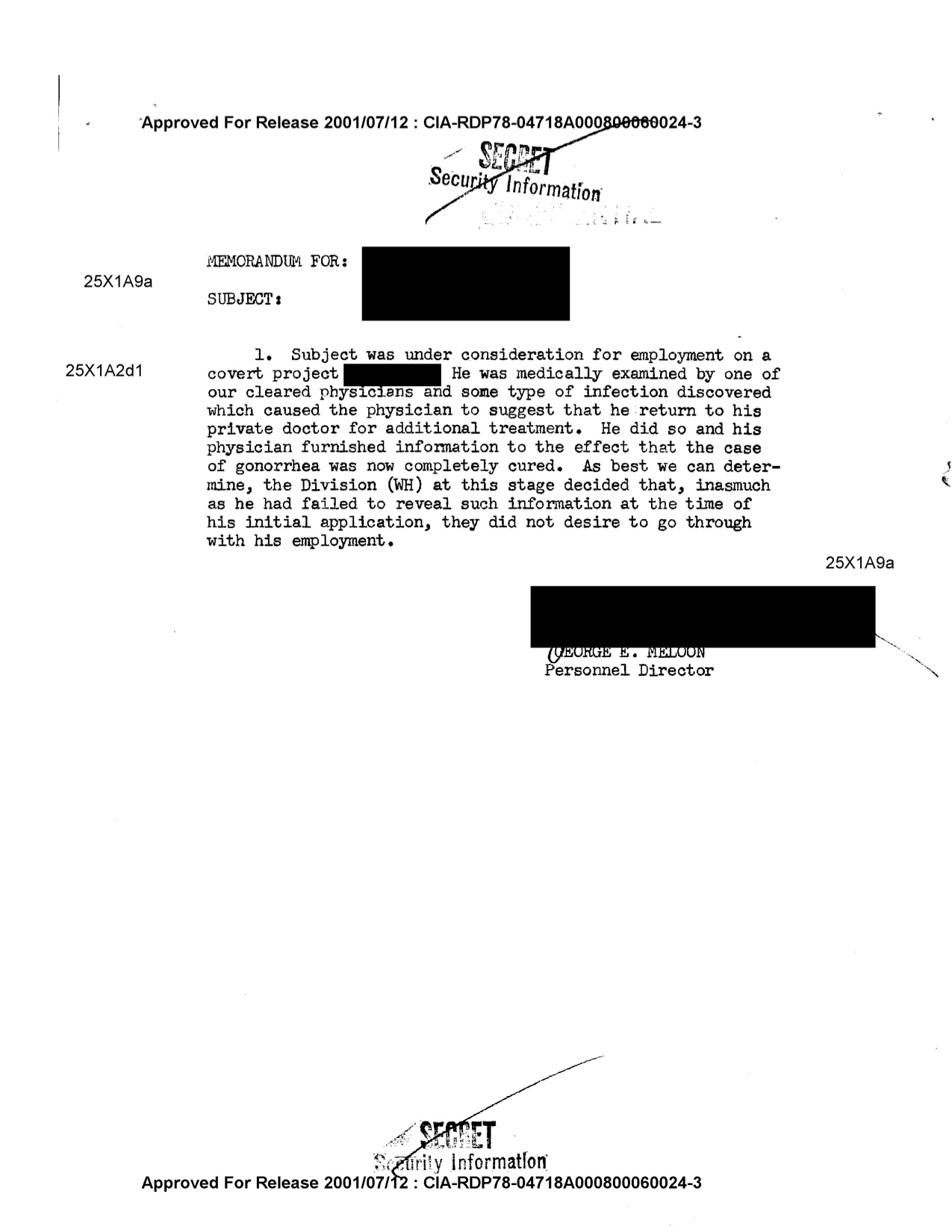 Unfortunately, he was not. The reason? He failed to disclose his gonorrhea to one of the CIA’s “cleared physicians.” D’oh! The subject’s regular physician provided the fact that the “gonorrhea was now completely cured” to the CIA’s physician, and while that was undoubtedly good news to the subject, it unfortunately demonstrated a lack of transparency on the part of the subject to his potential employers. They thus refused his participation in the covert project.