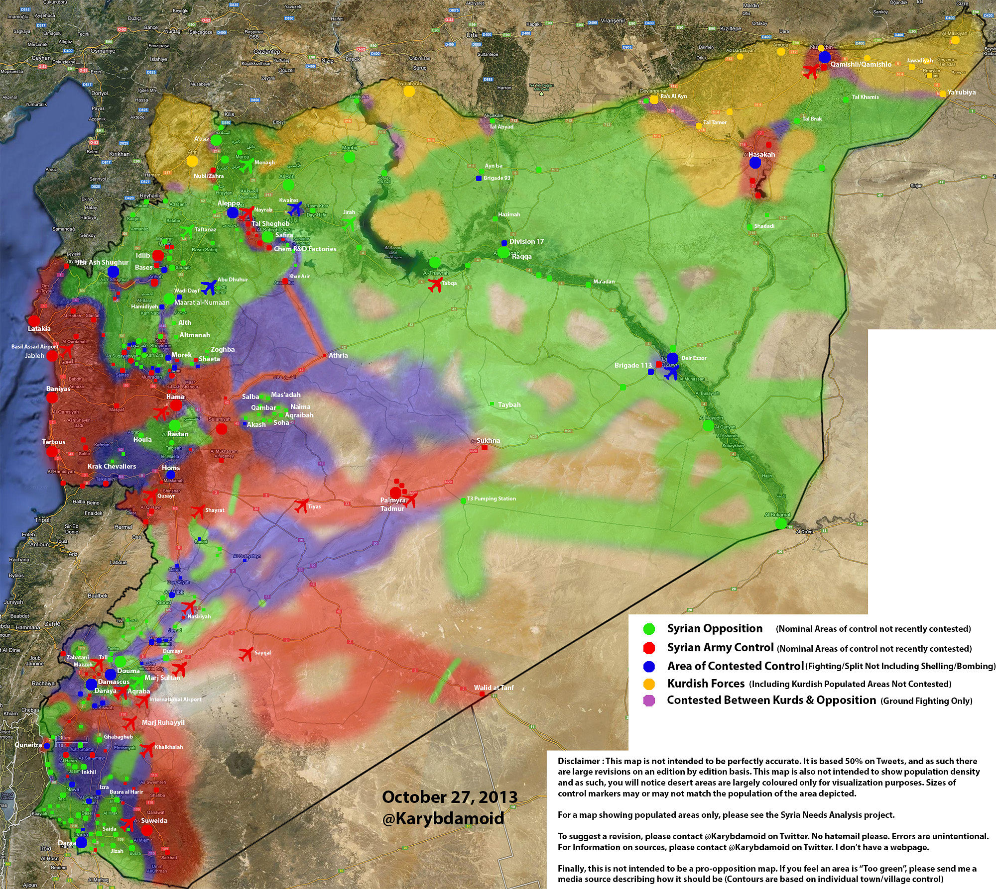 This map is, of course, not 100% accurate. In the fluid environment of an irregular war it is practically impossible to have 100% accuracy, particularly when the information is being collected from various electronic sources on the ground. However, I thought that in a general sense it would provid
