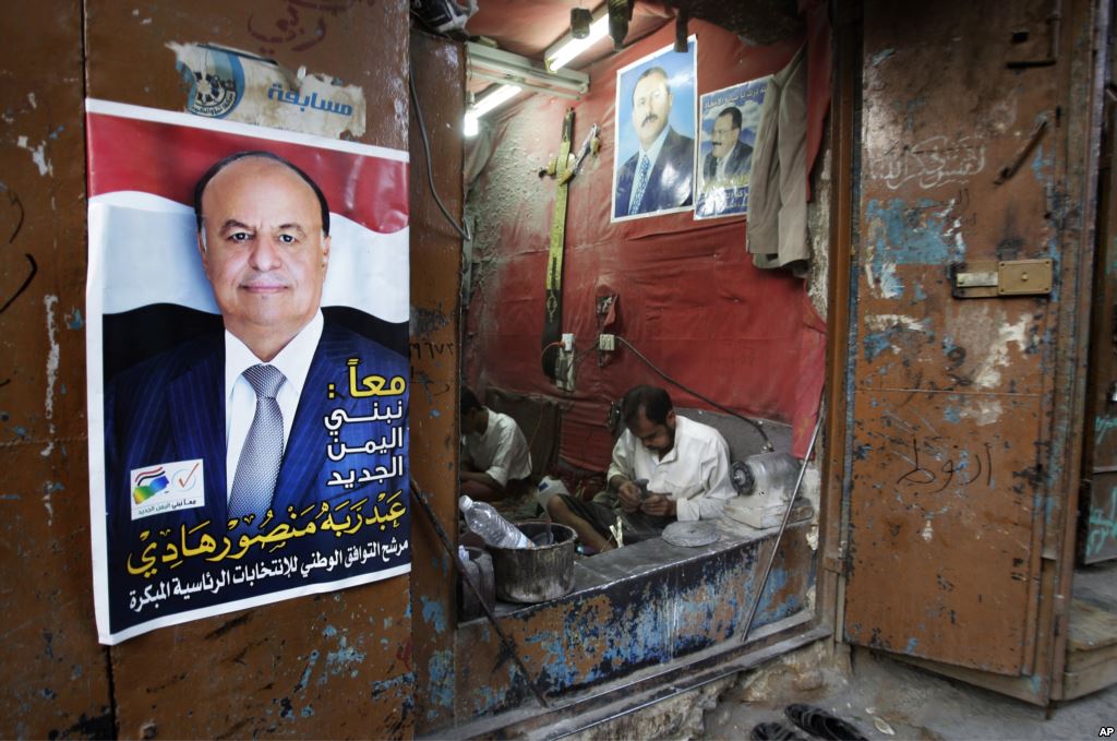 Men work in a shop while a poster of interim president Hadi hangs nearby.