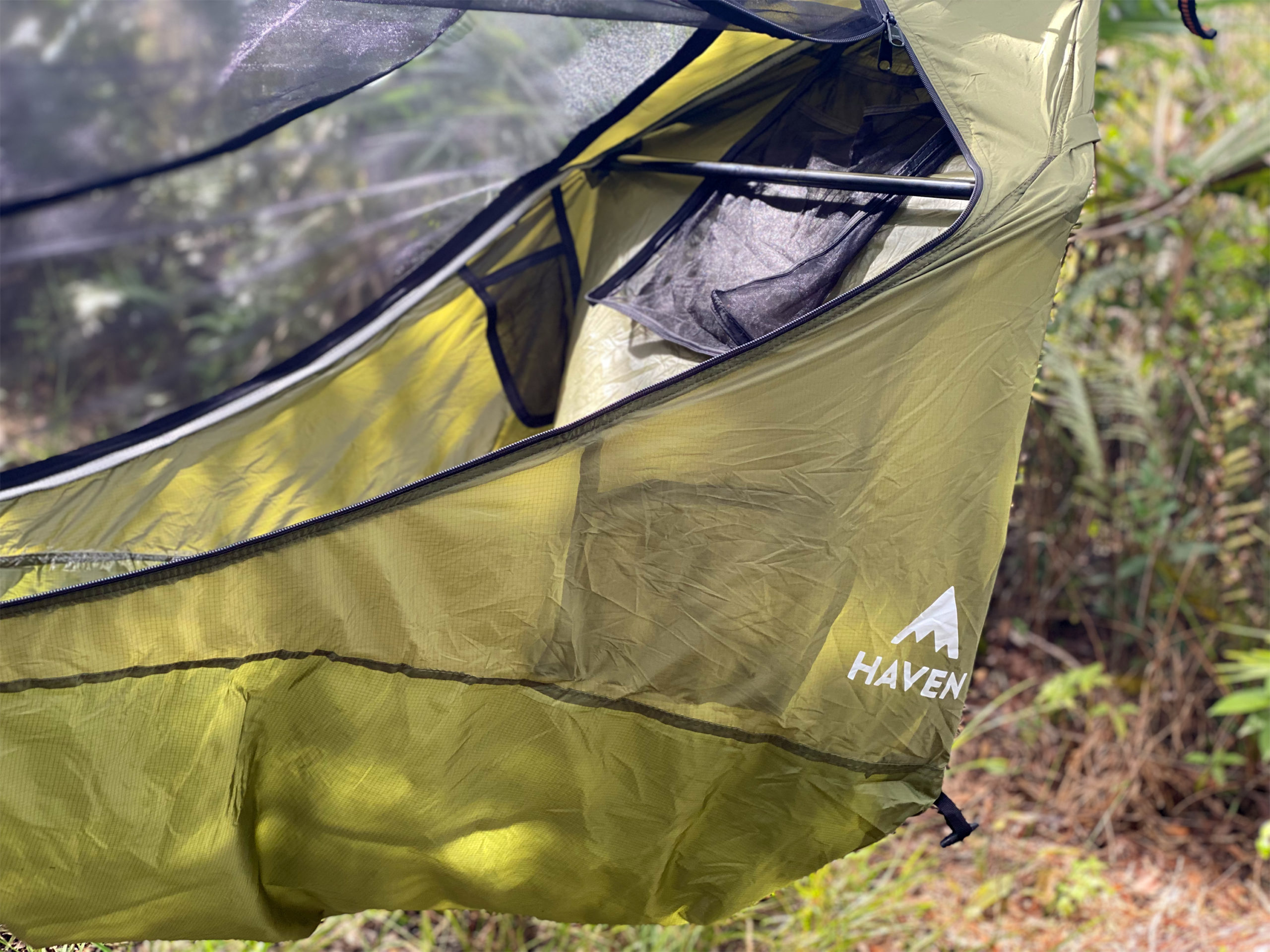 Haven Tents has fixed that with their very simple, effective design, which allows for laying flat. The spreader bars that go on the inside, plus the inflatable air mattress, allow for more comfort and stability than a normal hammock, and other hammock tents. That’s worth getting excited about.