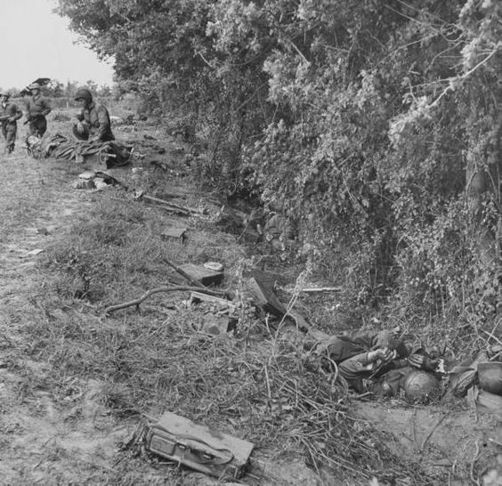On the second day of the Normandy invasion along hedgerows near Sainte-Mère-Eglise, dead German soldiers and their equipment fill a ditch while a wounded American is being treated nearby. Sainte-Mere-Eglise in WWII by Philip Barnett/Pinterest