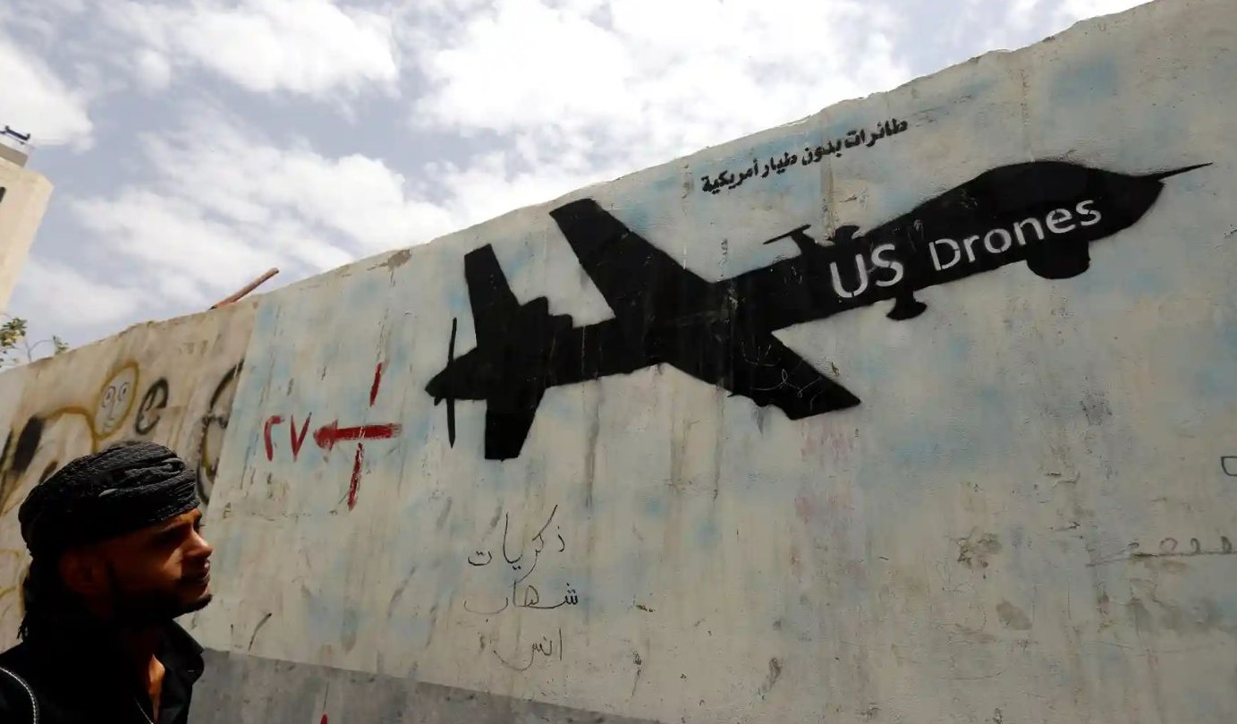 A Yemeni man looks at graffiti showing a US drone after al-Qaida in Yemen confirmed the death of its leader in a US drone strike on 16 June 2015. Image Credit: Yahya Arhab/EPA