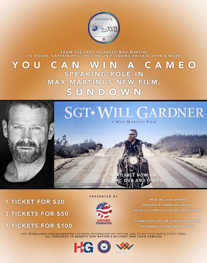 American Airlines’ Sky Ball 2019 Gala and Max Martini’s movie ‘Sgt. Will Gardner’ are raising money for four charities that support our nation’s warriors. They are donating four cameo roles each with one line of dialogue in the upcoming movie ‘Sundown’, which will be directed by Max Martini (13 Hours, Captain Phillips, Saving Private Ryan, The Unit).