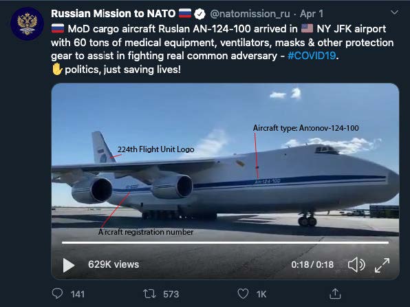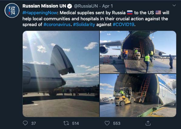 Russian Mission to the UN touting delivery of humanitarian aid arrival to JFK airport, NYC on 1 April.