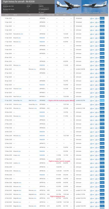 Using Flightradar24, a quick search for historical flight records for RA-82038 unsurprisingly reveals extensive travel to and from Moscow into various other countries. We are most interested in flights to Belgrade, Serbia; Latakia, Syria; and Ankara, Turkey, given that these flights contrast most starkly with the strong humanitarian theme of the NYC flight on 1 April propagated by Russia.