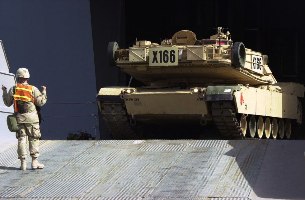 … or Naval ports for transport for deployments or exercises. Here, an Abrams tank is driven off of a ship.