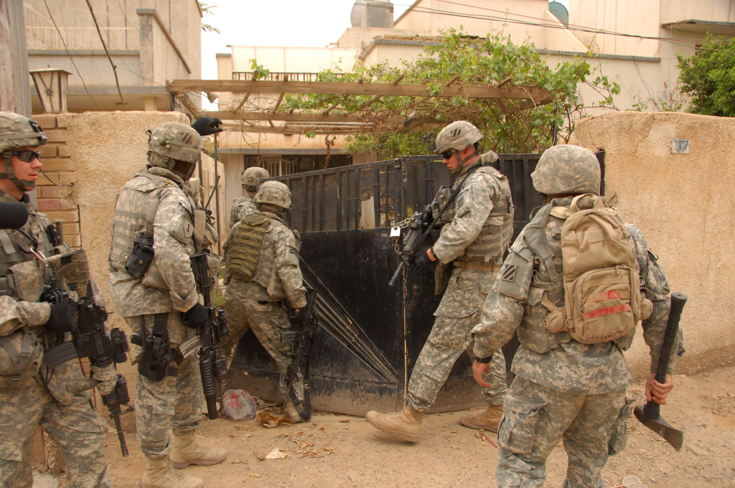 U.S. Army Soldiers gain entry to an abandoned house to search for possible weapons or other illegal materials while on patrol in Haidraq, Iraq, April 6, 2008. (U.S. Army photo by Spc. Charles W. Gill/Wikimedia Commons)