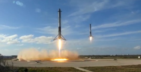 Two of the three first stage rockets landing safely for reuse following the first ever launch of the SpaceX Falcon Heavy.