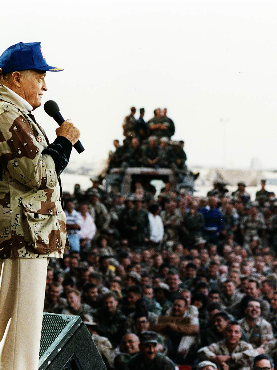 “My whole unit – the 101st Pathfinder Detachment 2/17th Cav – was invited. The detachment was comprised of 52 men. We woke up Christmas morning, 1990, with an invitation at the foot of our bunks. At the time, we were living on cots in the parking garage of King Fahd International Airport in Saudi Arabia. It was under construction. We had no idea the USO would be putting on a Christmas Show, never mind with Bob Hope.