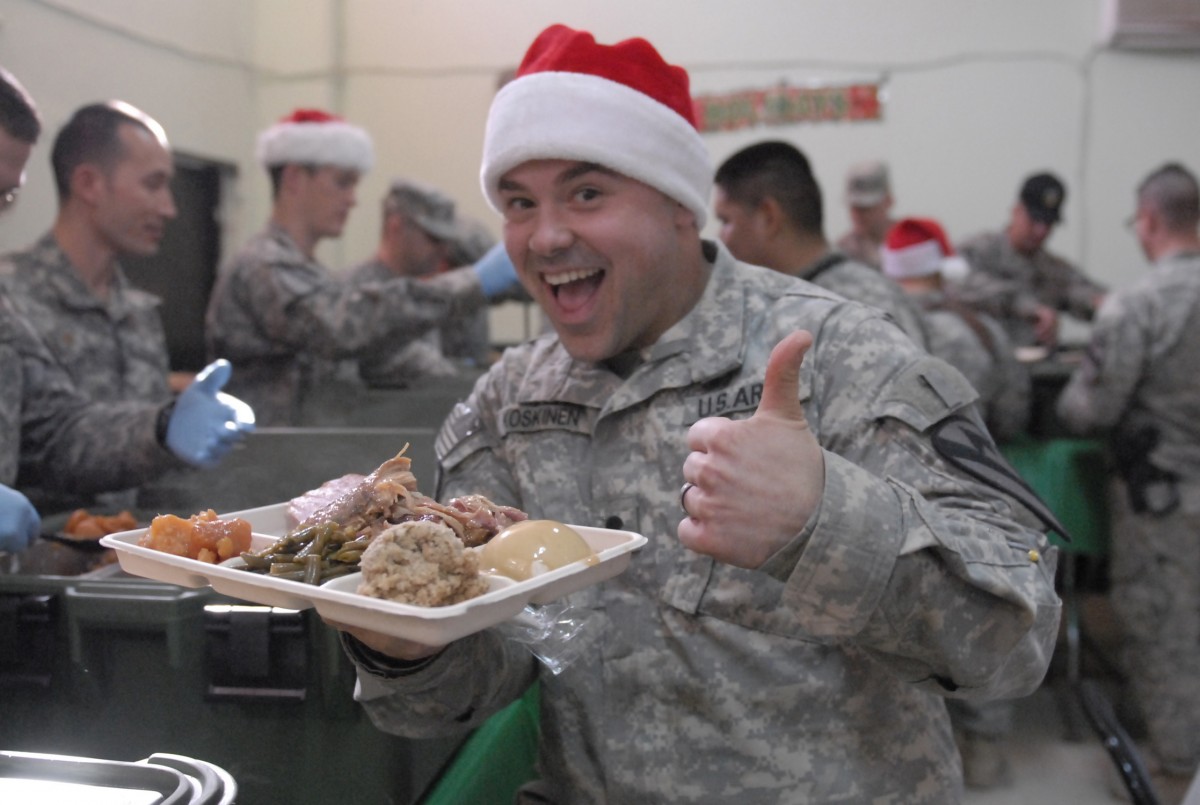 The look on this guys face says it all, doesn’t it? He’s got a plate piled high with food, turkey and all the trimmings. He’s indoors and with the men and women of his unit. This is as good a Christmas will get, but it’s good enough. Christmas while deployed to a war zone is an exercise in doing the best you can with what you have. When the United States went over to an all volunteer force after the Vietnam conflict, the Pentagon found it had to spend a lot more money on accomodations, recreation and food to keep volunteers reasonably comfortable and willing to re-enlist when their contract expired. You are seeing the effect of that in the above picture. Troops sent overseas to Iraq and Afghanistan in rear areas generally report that they were pretty well looked after. The chow was hot, available, thry could shower wioth hot water and they slept indoors and on beds too. The minimum requirements of being comfortable in uniform.