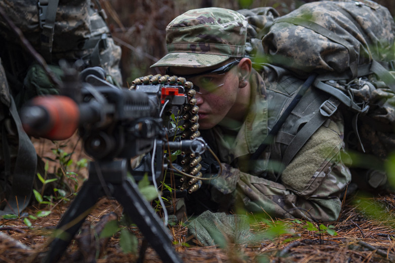 Senior Airman Zachary Dominguez, an Air Force Ranger Assessment Course student, aims down his sight Nov. 15, 2019, at Moody Air Force Base, Ga. The course teaches students critical tasks such as land navigation, troop movements and shooting and maintaining weapons. Over the course of 19 days, the Ranger Assessment Course evaluates students to determine if they possess the knowledge, willpower, and skill to attend Army Ranger School. (U.S. Air Force photo by Airman Azaria E. Foster)