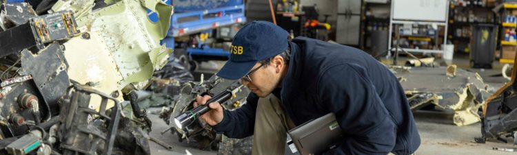 An NTSB inspector examines the remains of the disaster over the Potomac. Image Credit: The Air Current