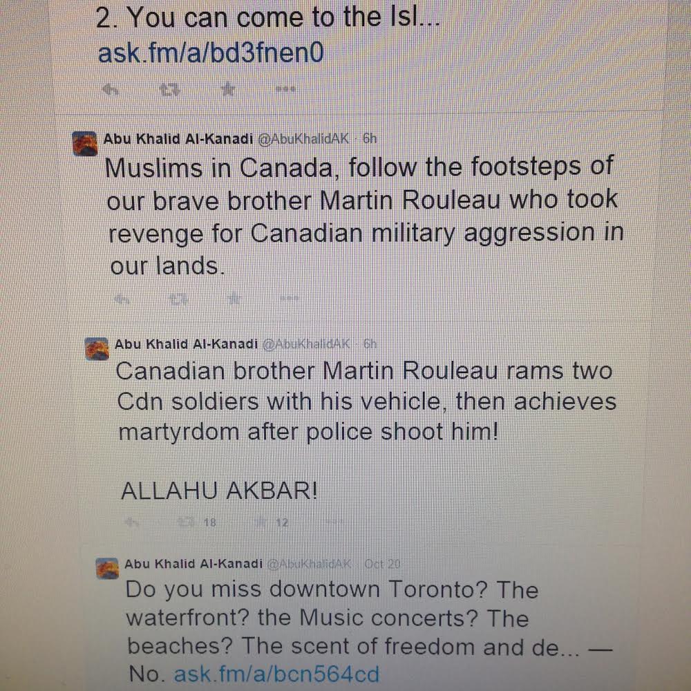 Abu Khalid Al-Kanadi added in another tweet a few minutes later: “Muslims in Canada, follow the footsteps of our brave brother Martin Rouleau who took revenge for Canadian military aggression in our lands.”