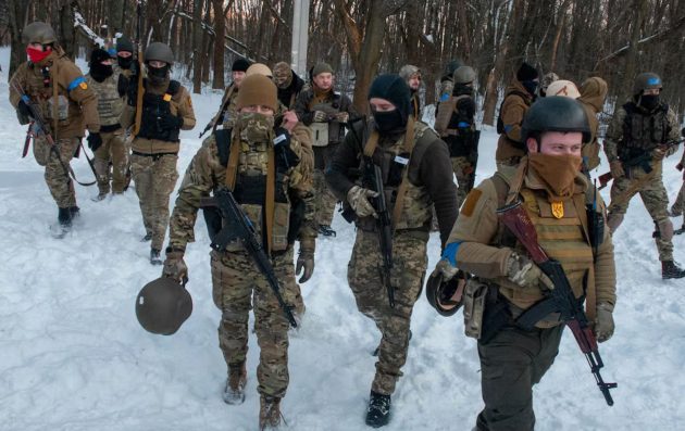 Ukrainian soldiers move through the snow outside Kharkiv, Ukraine. Image Credit: Andrew Marienko / Associated Press