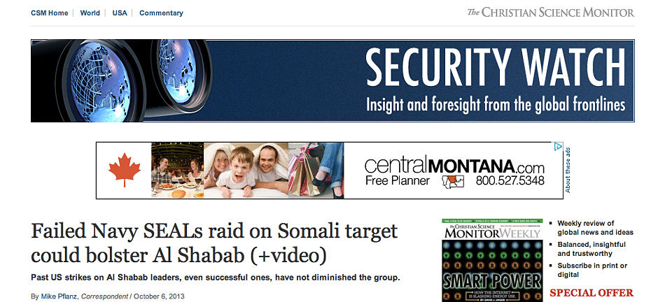 “The operation could have opposite its intended result of discouraging further attacks. Analysts warn that even earlier successful targeted strikes against Al Shabab, a Somalia-based Islamist militant group, failed to curb the group’s capacity to carry out international terror attacks, and that failed missions could in fact bolster its support and recruitment.”-Mike Pflanz reporting for the Christian Science Monitor