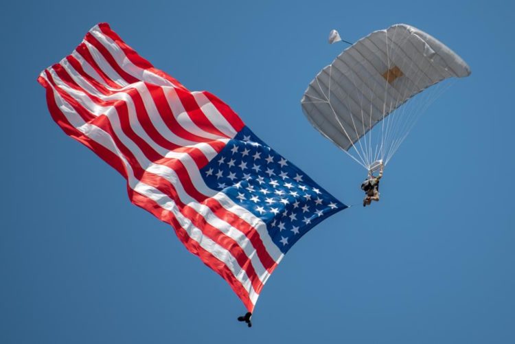 An Airman from the Kentucky Air National Guard’s 123rd Special Tactics Squadron is one of 10 operators to parachute into the Ohio River from a Kentucky Air Guard C-130J Super Hercules aircraft to kick off the annual Thunder Over Louisville air show in downtown Louisville, Ky., April 23, 2022. This year’s event celebrated the 75th anniversary of the United States Air Force. (U.S. Air National Guard photo by Dale Greer). Source: https://www.dvidshub.net/image/7160318/thunder-air-show-honors-air-force-75th-anniversary